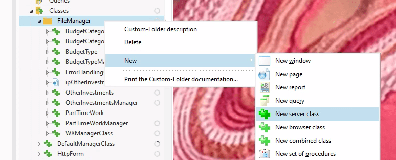 - In the project explorer in the Class section right click, and select New -> New server Class. Note I have a custom folder called FileManager, where I store all of out File Manager classes to get them organized, by right clicking on the folder, the class gets created in that folder.