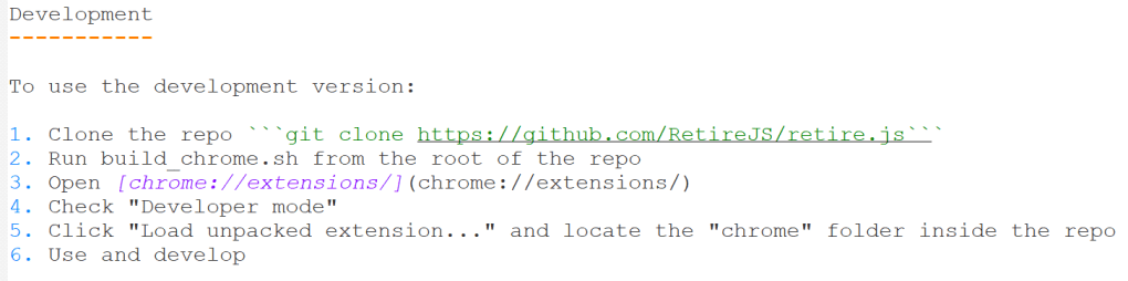 So head over to https://retirejs.github.io/retire.js/ and download the zip file. Once you unzip it, you will see that it has a build_chrome.bat file, as well as a chrome directory. You need to run the .bat file, which sets up the chrome directory with everything it needs.