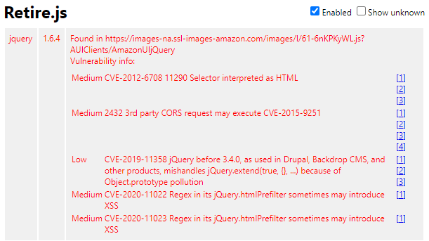 In the above screen show the icon that looks a bit like a blue earth and a red 3 overlaid on it is Retire JS, and it is indicating that there are 3 issues on the site I am on. Which brings us to out next topic, by no means should you think that this is a PCSOFT / WEBDEV issue. No matter what web environment you are developing in, you will constantly be chasing updates to JavaScript libraries, etc. To prove that point lets take a look at a couple sites you might recognize.