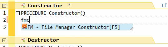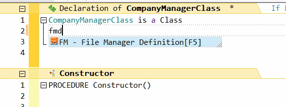 Now we simply type FMDin the declaration area and since that is the shortcut to the File Manager Definition Code brick it pops up as a select we can take