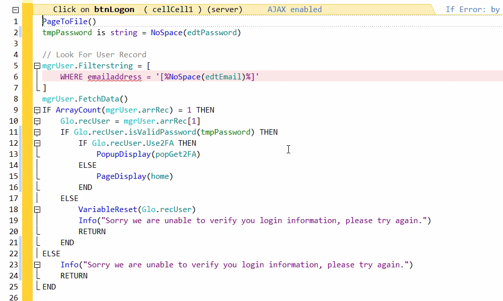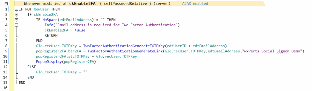 Line 9 uses another new 2FA function (TwoFactorAuthenticationGenerateLink) to generate a specially formatted URL that is used for 2FA. We are assigned the returned value to the barcode control on the popup, therefore displaying it as a QR code. Note: There appears to be an issue with the online help and intellisense for this function, they indicate only needing 2 parameters (the TOTPKey and the name of the app), but the example code provide shows 3 parameters with the middle parameter being the email address of the user. I got a compile error when I tried to use the 2 parameters as suggested by intellisense, but it worked fine when I used all 3 like the example code. I have reported this to PCSOFT.