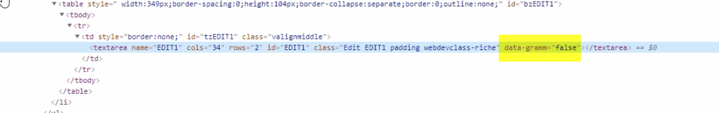 With enough searching on Google you will find that adding the attribute data-gram = “false” to your control will disable the plug-in for a control as well. You will also find references to data-gram_editor = “false” but apparently that is an old attribute. Our challenge is how to get that attribute on the control in WEBDEV, there doesn’t appear to be a place to do it directly in the control description screens.