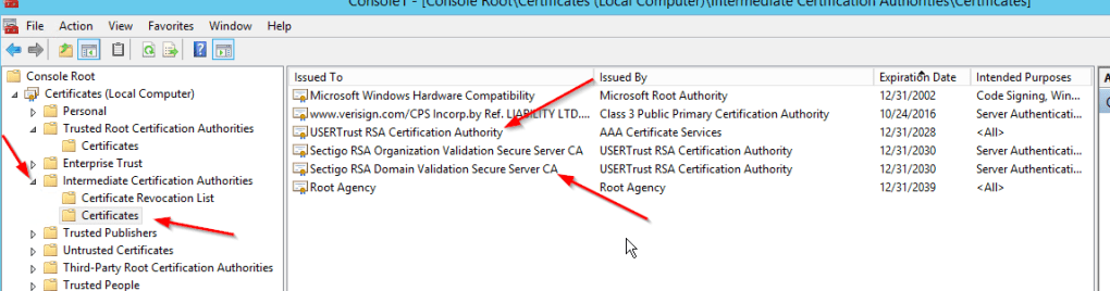 To install them on your windows server that is having the issue, run mmc, then add the certificate snap in, for the local computer.