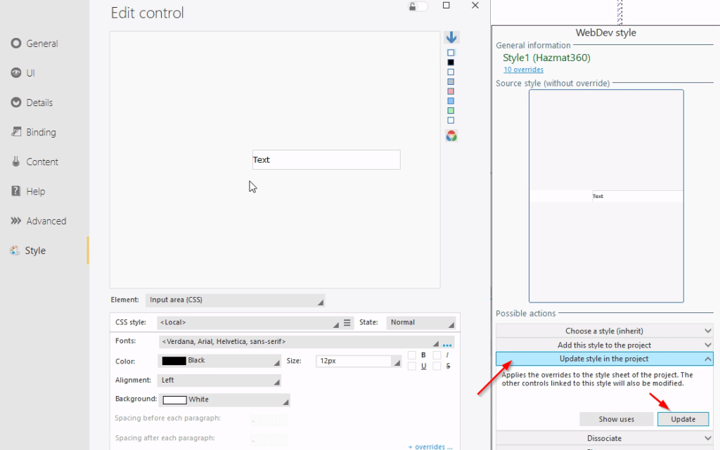 We want those overrides to be applied to all of the controls using Style1, So we choose Update style in the project and press the Update Button
