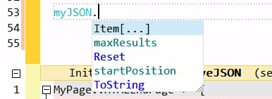 The difference is now intellisense knows the makeup of our JSON can can assist us, so if I type myJSON. it begins prompting me, and you can see maxResults and startPosition, along with their exact case format are available, and it even shows me that Item is an array.