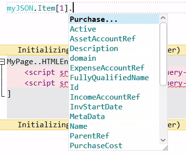 If I take it a step further and type myJSON.Item[1]. intellisense provides me with a list of the fields in Item
