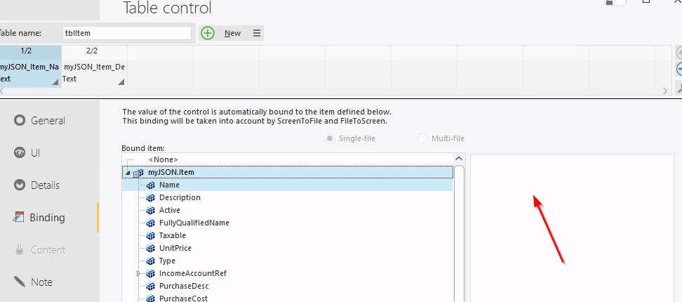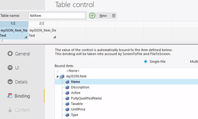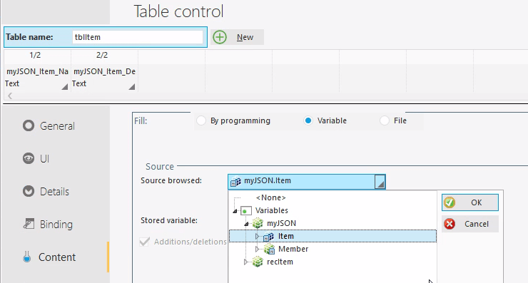 If you are like me at this point you are really excited and the first thing you want to do now is try to use the myJSON.Items as the source for a table or looper control. However although we are able to set the source