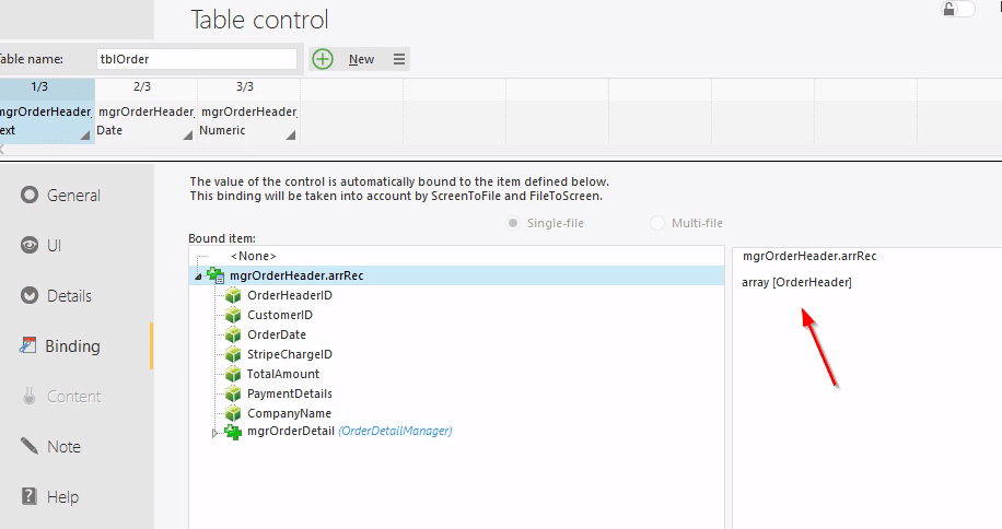 I have not been able to get it to actually work and display the values. I believe the issue is that the control isn’t fully seeing it as an array. For example when I look at a table control where we are using a class as the source notice on the binding the top line shows as an array of OrderHeader