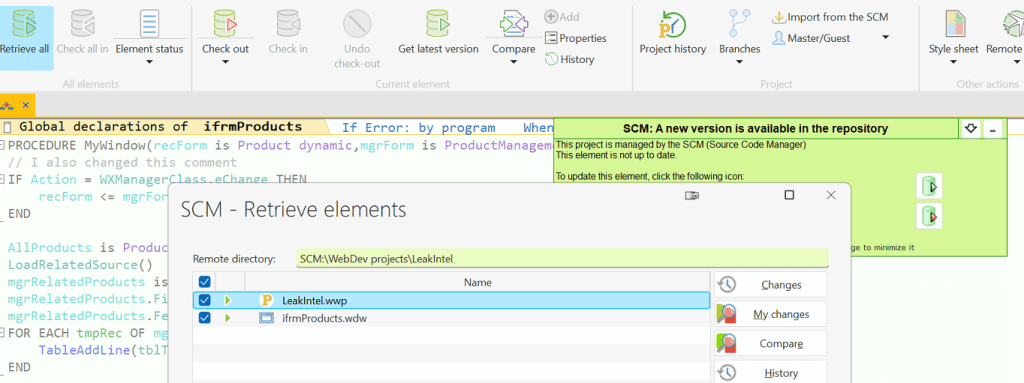 #9 We went through those same steps a 3rd time except, he ignored the popup to retrieve the changes to the ifrmProducts window and instead went straight to the retrieve all button, and it indeed gave him both the window and the project updates. And we did not lose my changes to the project code.