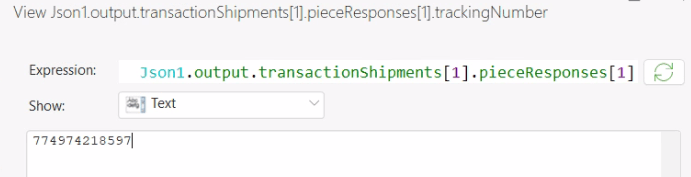 Trace(Json1.output.transactionShipments[1].pieceResponses[1].trackingNumber)