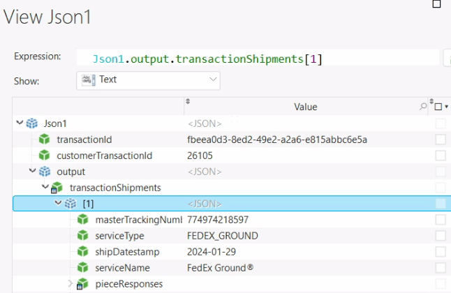 However, if we look at Json1.output.transactionShipments[1].pieceResponses[1].trackingNumber we can clearly see it has a value.