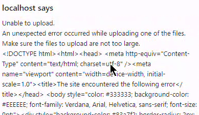 I can’t see where the error in the multifile upload is because it crashes on the browser side before my server code fires but I suspect the issues are very similar. In this instance, the error is a popup message on the browser with a bunch of HTML formatting.