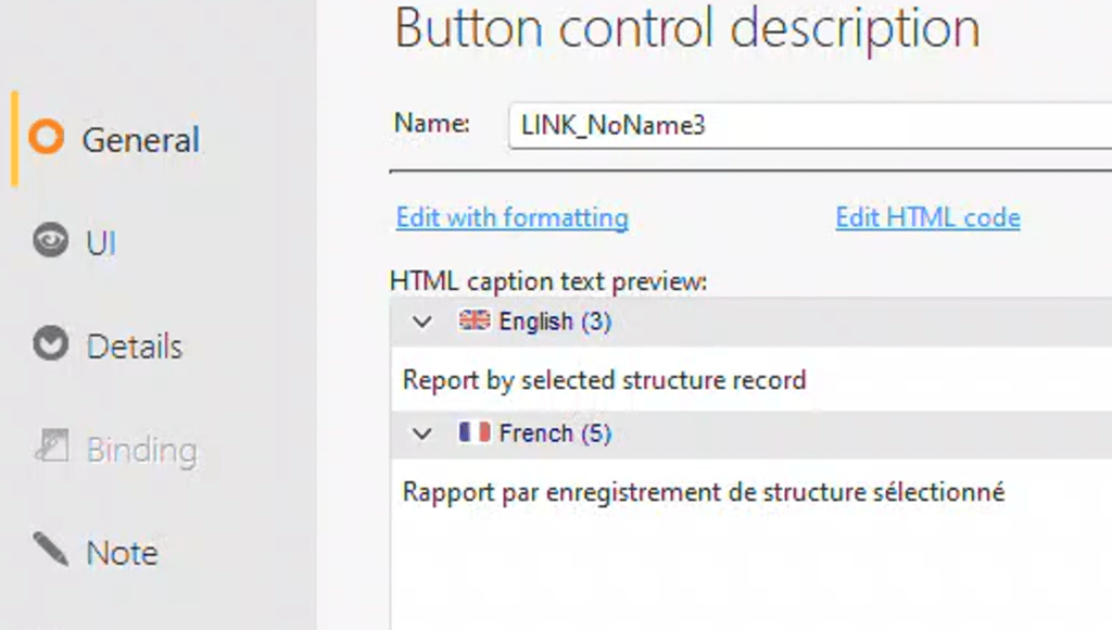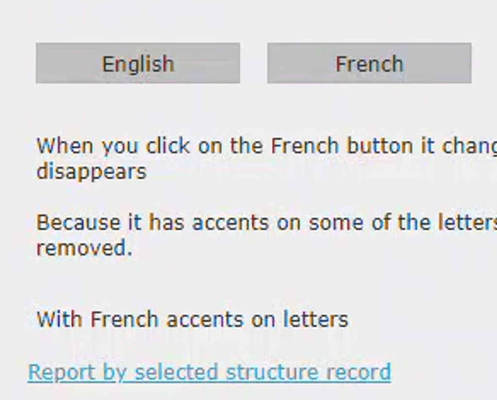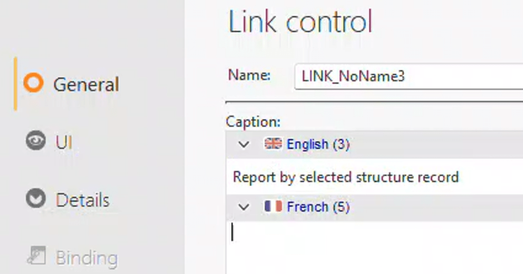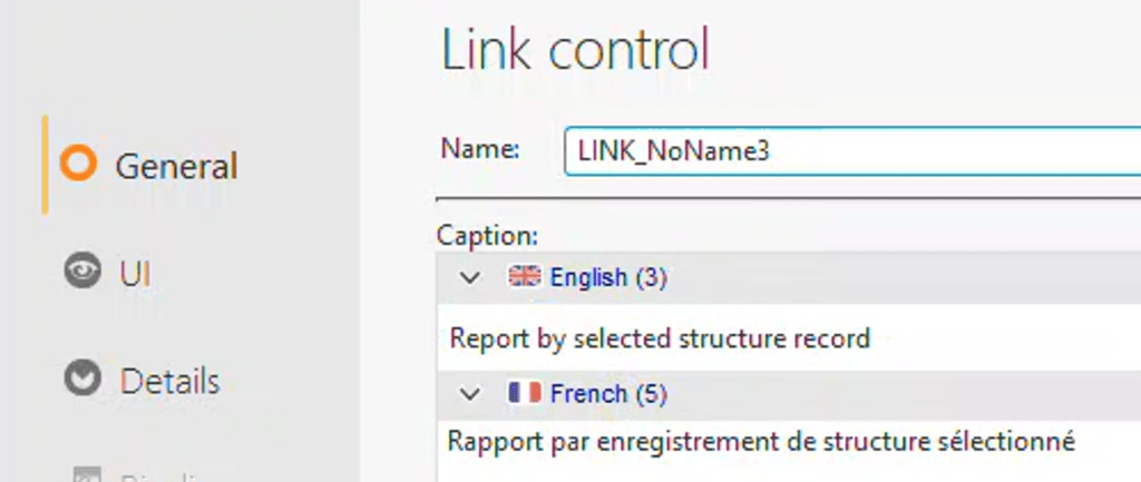 This issue manifests in two ways. To observe this behavior, create a link control that includes both an English and a French caption. For instance, use “Report by selected structure record” in English and “Rapport par enregistrement de structure sélectionné” in French.