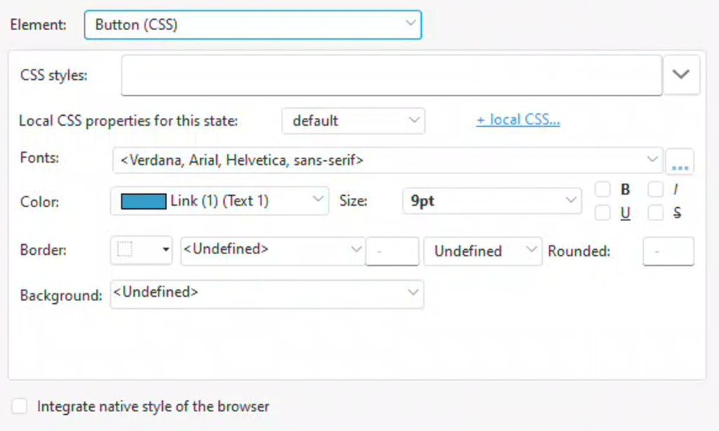 Now we delve into the “+ local CSS…” section, ironically represented here as a link. We start by defining how we want the link to appear in its default state. For example, we set the Alignment to Left, and the Decoration to Underline (this can be set to None if we only want the underline to appear when hovered over). The Font, Size, and Color were already configured on the basic settings screen.