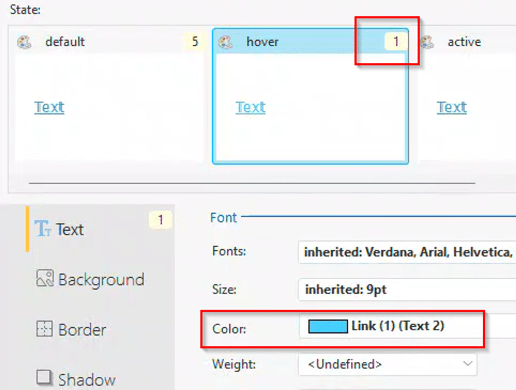 For the hover state, we only need to set one override by changing the color to Link (1) (Text 2). All other settings should be set to inherited or undefined, which allows them to use the values from the default state. The interface indicates how many settings are changed for each state.