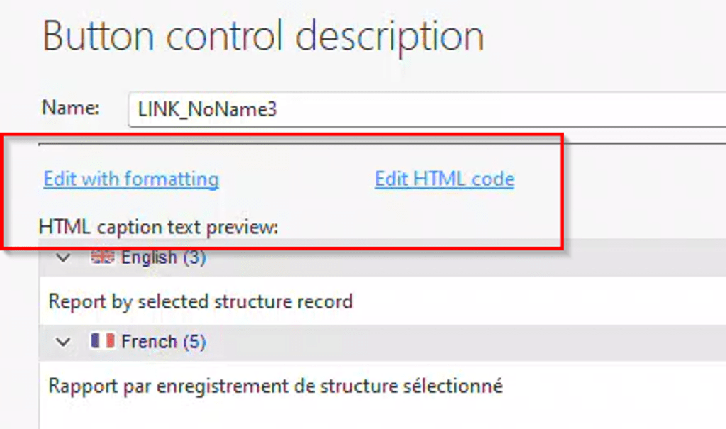 The lack of HTML support is significant to me. Upon comparing the description windows of the link control and the button control, you’ll notice a few variations. Two additional options appear: “Edit with formatting” and “Edit HTML code”. Instead of merely “caption”, the label now reads “HTML caption text preview”. This is because buttons fully support HTML for their captions.
