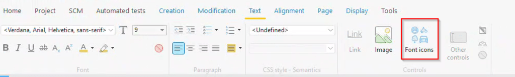 When you choose the ‘edit with formatting’ option, the IDE shifts to a word processor-style editing mode for the caption, and the ribbon bar then changes to the text tab. Notice the button titled “Font icons” on the right.