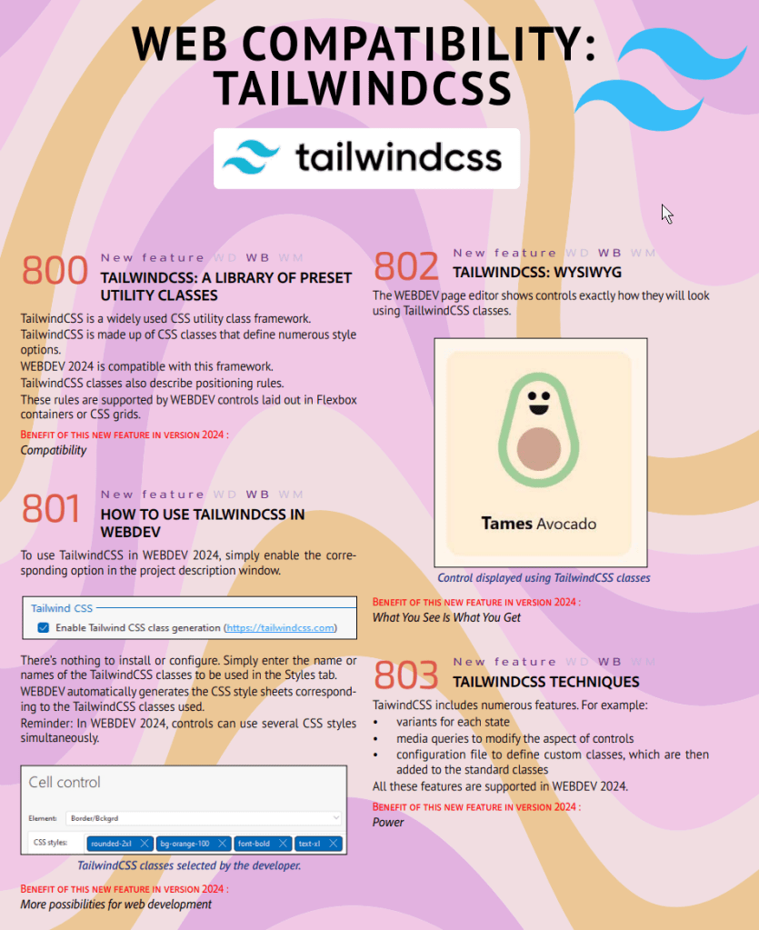 One exciting feature of version 2024 is the support for Tailwind CSS. This addition not only offers an avenue for working with web designers who aren’t necessarily WEBDEV developers, but it also signifies PCSOFT’s commitment to standard web technologies. As hinted in several of my recent posts, a series of upcoming articles will delve into various topics related to WEBDEV site design. The focus will be on modern techniques and technologies for aesthetics and user experience. The planned topics include: