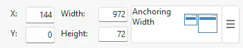 It is positioned at 144 x 0 and has dimensions of 972 x 72. The anchoring is set for width only. The test coloring used is “bg-blue-200”.