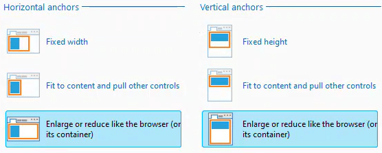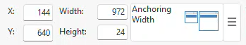 It is positioned at 0 x 0 and measures 144 x 664, with anchoring set for both width and height. The only difference is the Horizontal anchor, which is set to “Fit to content and pull other controls” instead of “Enlarge or reduce like the browser (or its container).”