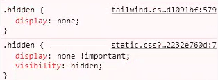 Why is this happening? Once again, the extra CSS WEBDEV generates is causing an issue. This time, it’s coming from the static.css file. Using the developer tools, we can see our Tailwind CSS class .hidden, but it’s crossed out, indicating it’s not being applied. Conversely, the .hidden class from the static.css file is being applied.