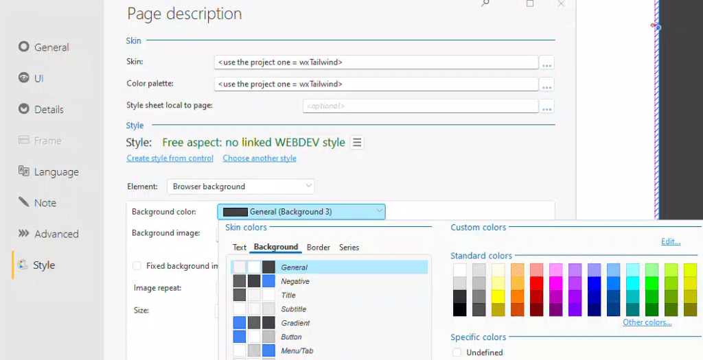 Open the wxTailwind project and create a page if one does not already exist. In the page description, go to the ‘Style’ tab. Select the ‘Browser Background’ element and then expand the options for ‘Background color’.