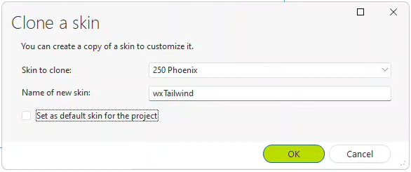 Unfortunately, it doesn’t allow me to start with a blank Skin, so I’ve chosen the 250 Phoenix Skin. I’ve named it wxTailwind. Remember to uncheck the “Set as default skin for the project” option if you don’t want this to impact the currently open project.