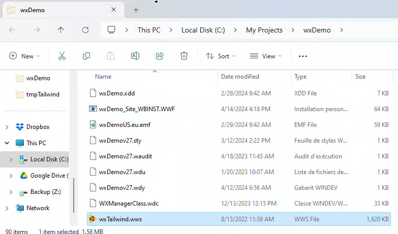 If we had chosen “Set as default skin for the project”, we would be ready to go. However, we want this Skin to be available for our other projects, so we need to copy it to the IDE. As I have installed the IDE with WEBDEV and WINDEV Mobile integrated with WINDEV, the folder for me is C:\WINDEV 2024\Personal\Skins. Ensure you also copy the wxTailwind.wws file into the new folder; otherwise, you will not have any styles.