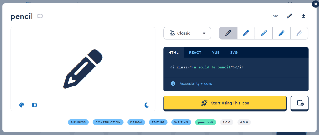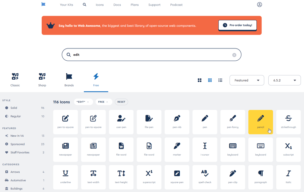 The first step is to visit the Font Awesome website and select an icon. To limit your options to free icons, apply the Free filter and search for ‘edit’. This will present you with 116 icons to choose from. For this button, I decided to use the ‘pencil’ icon.