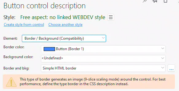This provides us with a button that behaves similarly to my Tailwind version, except for the additional focus settings I applied in Tailwind. If someone wants to replicate these settings in the WEBDEV style interface, I would be glad to share the details. However, adjusting the numerous tabs and states just to implement the few settings I did felt exhausting to me!
