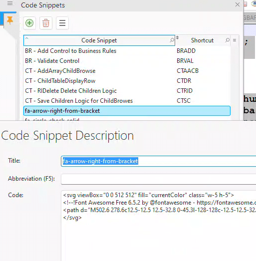 You might find it inconvenient to copy the SVG code from Font Awesome, and then add the fill color and size class every time. Although it may seem like you need a variety of different icons in your app, you usually don’t need as many as you think. Basic icons like add, change, and delete are often repeated, but you can avoid redundancy with control templates or other methods. If there are frequently used SVGs and you don’t want to copy and paste the code each time, consider using code bricks/snippets as a useful storage solution.