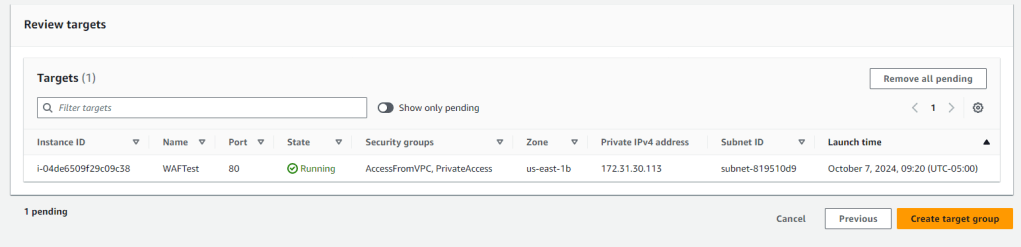 After clicking on the Include as pending below button we see a review targets section showing the targets we have added and we can click the Create Target Group button
