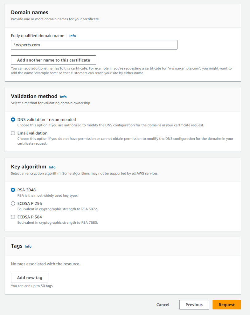 We want our web traffic to be over HTTPS so we need a certificate. Since we are using all AWS services the easiest and FREE way to do that is via the AWS Certificate Manager. Head over there and click the request button.