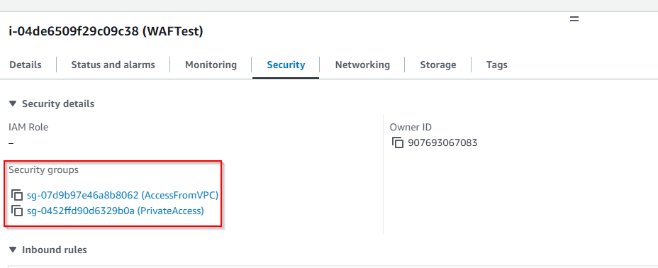 We also add two security groups to this Instance. AccessFromVPC (which will allow HTTP traffic from within our VPC) and PrivateAccess (which will allow the developers full access). Notice this means there is absolute no public access to this sever whatsoever. Other than from the developers IPs the only way to access the server is from within the VPC and then only via HTTP (port 80). As you can see this makes for a much more secure configuration even before we add the WAF.