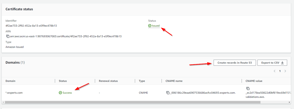 The next screen shows us a list of domain names for the certificate needing validation, and we can simple click the Create records in Route 53 button to automatically create the required CNAME entry for us. If you are using an outside service for your DNS you would need to manually create the CNAME entry in that service. Once you have create the Route 53 records it may take a few minutes to validation to take place but eventually you should get a status of Success for the validation and Issued for the certificate.