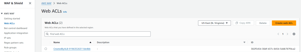 We already created our WAF when we create the ALB but we can add the settings to add some additional rules. For the WAF & Shield menu if we select Web ACLs we will see the WEB ACL that was automatically created with the 3 rules.