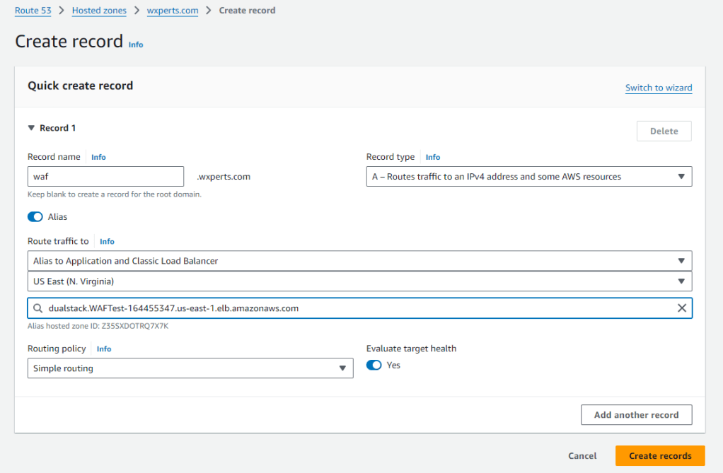 Now that we have the ALB we can add add an A record to point WAF.wxperts.com to the ALB. So head back over to Route 53, Add an A record for WAF. Turn the Alias switch on which will allow us to point the domain towards amazon services, choose Alias to Application and Classic Load Balancer, and the correct Region. Then you will be able to select the ALB we created above.