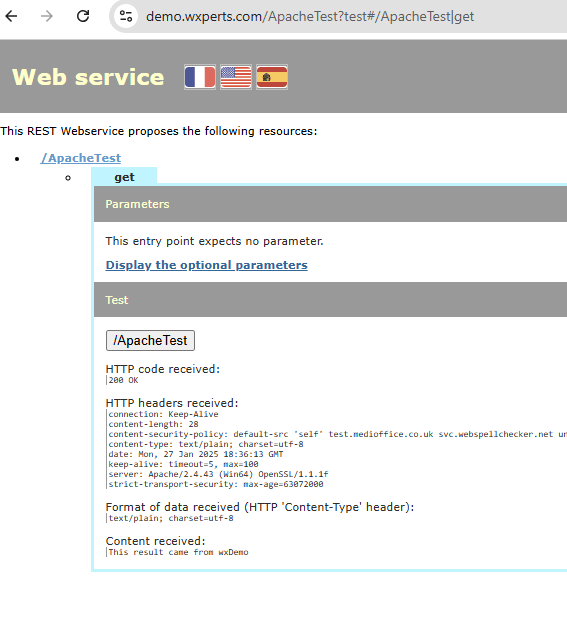 That is an endpoint named ApacheTest that was published as part of my wxDemo webservice project, and if we run the test of the server we will find all works as expected and it returns “This result came from wxDemo”