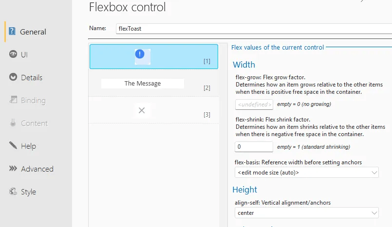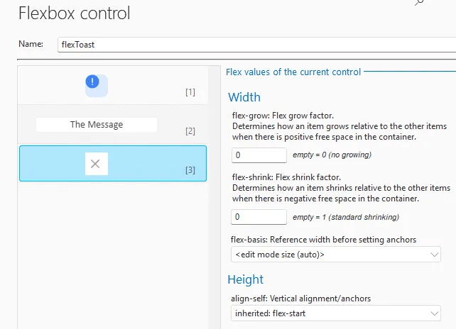 The static control that holds the message is set to grow while maintaining the default shrinking and flex-start height. This allows the popup to adjust to any message size while keeping the font icon and button properly sized and positioned. Flexbox proves incredibly useful once you grasp its concepts.