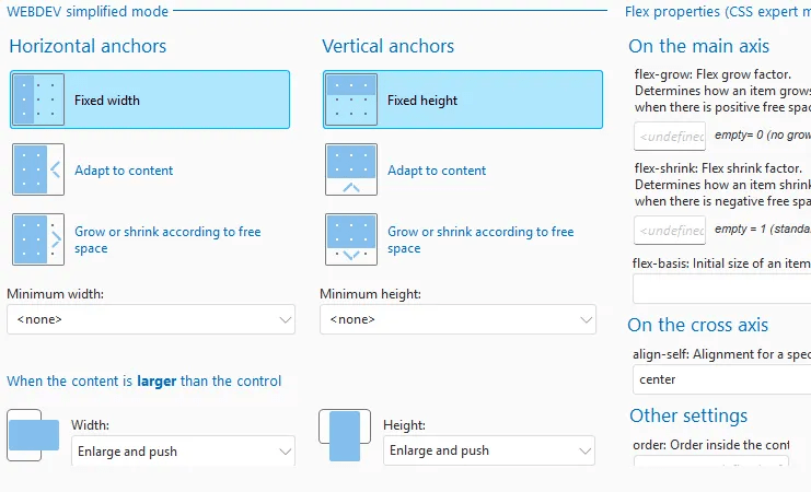 The flex settings again use row direction with no wrap. The horizontal alignment is set to center, and the global vertical alignment is flex-start. Since there is only one control, we don’t need to specify individual row alignment or spacing.