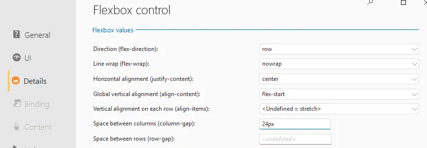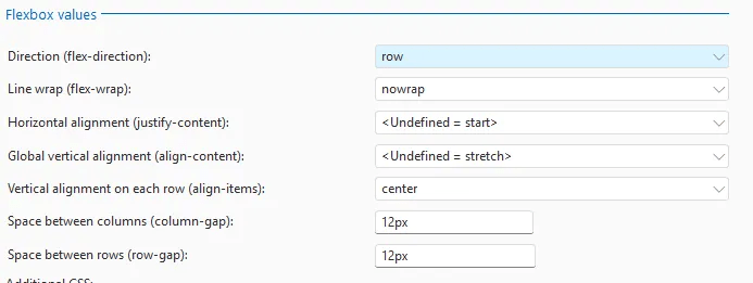 The Flexbox control uses row direction without line wrapping. Its horizontal alignment is set to the default “start”, while the global vertical alignment uses the default “stretch.” Each row’s vertical alignment is set to “center,” with 12px spacing between both columns and rows.