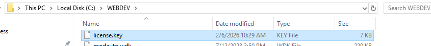 On the first server I had to upload that file to the WAS server into the WEBDEV directory and rename the file to license.key.